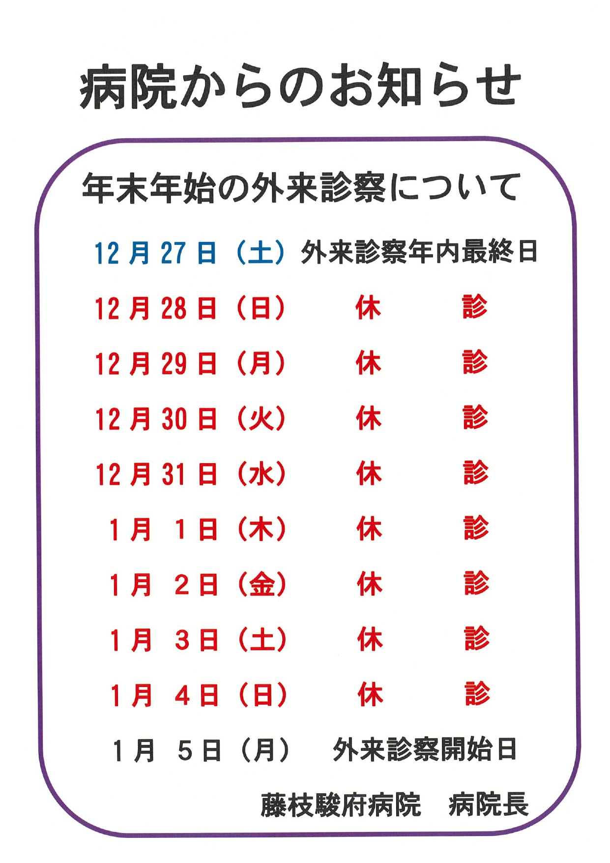 年末年始外来休診日のお知らせ